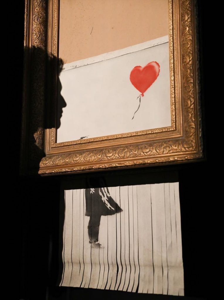 Love is in the Bin is a 2018 art intervention by Banksy at Sotheby's London. According to Sotheby's, it is "the first artwork in history to have been created live during an auction." His 2006 painting of Girl with Balloon unexpectedly self-destructed immediately after it was sold at auction. The damaged painting was later renamed Love is in the Bin. It has been on permanent loan to the Staatsgalerie Stuttgart since March 2019. In October 2021, it sold at auction for £18,582,000, a record for the artist.
